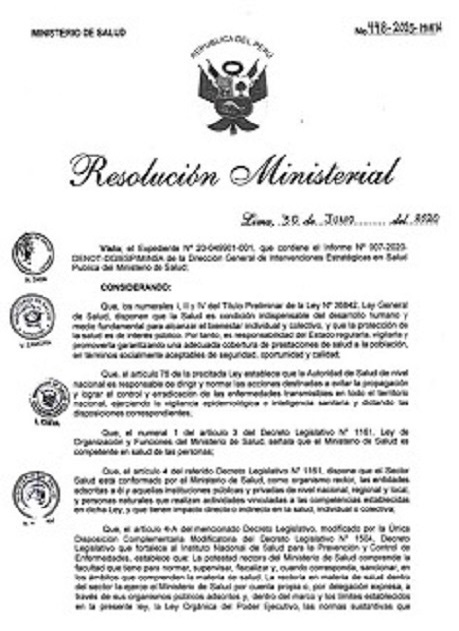 La Resolución Ministerial 448-2020-MINSA establece los lineamientos oficiales para la vigilancia, prevención y control de la salud de los trabajadores con riesgo de exposición a SARS-CoV-2 (COVID-19), garantizando la sostenibilidad de las medidas en todas las organizaciones.